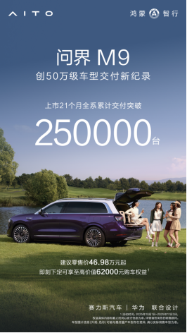 创50万元级交付纪录,问界M9交付破25万辆,书写中国品牌新高度